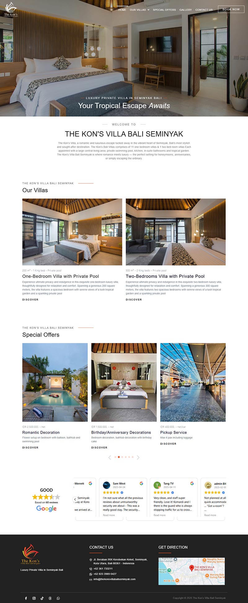 The Kon’s Villa, a romantic and luxurious escape tucked away in the vibrant heart of Seminyak, Bali’s most stylish and sought-after destination. The Kon’s Bali Villas comprises of 11 one bedroom villas & 1 two bed room villas Each appointed with a large central living area, private swimming pool, kitchen, in-suite bathrooms and tropical garden. The Kon’s Villa Bali Seminyak is where romance meets luxury — the perfect setting for honeymoons, anniversaries, or simply escaping the ordinary.